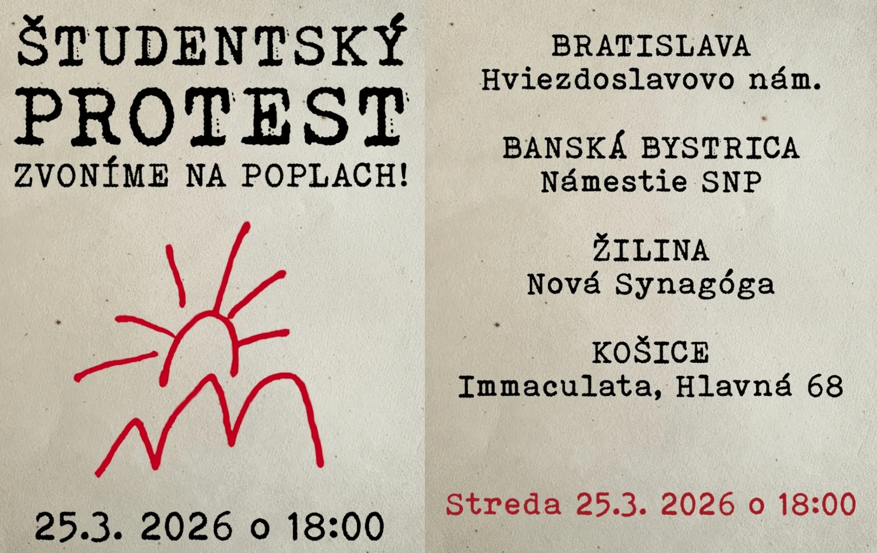 Dobrý deň, posielame vám aktualizovaný zoznam plánovaných zhromaždení na nasledujúce dni. V Bratislave sa koná zhromaždenie dnes, zajtra v Čadci. Budúci týžden bude viacero protestov v stredu v rovnaký čas, ktoré organizujú študenti. Všetci ste pozvaní. Dnes: Živá reťaz pri STVR (Bratislava)Kedy: 19.3.2026 o 17:30 BRÁŇME SPOLU STVR Príďte spolu s nami vytvoriť živú reťaz okolo budovy rozhlasu. Piatok: SPOLU ZA DEMOKRACIU (Čadca)Kedy: 20.3.2026 o 17:00 ČO CHCEME DOSIAHNUŤ? Slovensko, ktoré drží slovo a krajina, ktorá plní sľuby svojim občanom a občiankam. Demokratický domov pevne zakotvený v Európe, kde sa hovorí pravda, zákony platia pre každého rovnako od Kysúc až po Košice, a každý Slovák a Slovenka dostane férovú šancu na život, aký si zaslúži. ČO ROBÍME PRE TO, ABY SME TENTO CIEĽ DOSIAHLI? Postavíme sa korupcii a arogancii moci. Budeme chrániť ústavu, brániť nezávislé inštitúcie a zjednotíme demokratický zmýšľajúcich ľudí v mestách aj dedinách na Kysuciach. Spoločne tak budeme hájiť férovosť, bezpečnosť a európsku budúcnosť Slovenska Streda: Študentský protest - Zvoníme na poplach!Kedy: 25.3.2026 o 18:00 Zvoníme na poplach, pretože na Slovensku sledujeme pokus o kradmú normalizáciu spoločnosti prostredníctvom štátnej moci. Už rok a pol pred voľbami vláda uvažuje o rušení možnosti korešpondenčnej voľby, pretože jej preferenčné výsledky nahrávajú opozícii. STVR sa vyhráža prepustením zamestnancov a zamestnankýň, ktorý sa postavili na odpor tomu, aby sa z verejnoprávnej televízie a rozhlasu stal nástroj vlády na politický boj. Premiér zatiaľ za zatvorenými dverami kampaňuje na školách so študentmi, ale verejnej diskusii sa vyhýba. Namiesto riešenia bytovej krízy, zelenej politiky, nedostatku učiteľov alebo odchodov mladých do zahraničia je témou krvavá ruská ropa a vydieranie Ukrajiny. Chaos v ktorom žijeme, sústavne spochybňované fakty, fabrikované škandály a hľadanie verejného nepriateľa je prostredie v ktorom prekvitá fašizmus. A to sme ešte len rok a pol pred voľbami. Tento protest zvolávajú študentky a študenti naprieč Slovenskom, ale môže prísť každý. Chceme ukázať pretrvávajúcu silu a odhodlanie brániť naše životy v tejto krajine pred normalizáciou a ťahaním Slovenska do sféry vplyvu Ruska. Páči sa vám čo robíme? Podporiť nás môžete akoukoľvek sumou na Buy me a coffee, ďakujeme ❤️ Pridajte sa do našej WhatsApp skupiny a dostávajte aktualizácie ihneď. Tím Protestuj.sk |